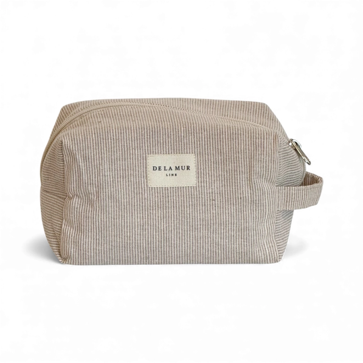 Keskmise suurusega meigikott, millel on peal lukk ja küljel sang. Valmistatud kergest tekstuursest kangast (80% puuvill, 20% polüester) heleroosa triibulise mustriga.
